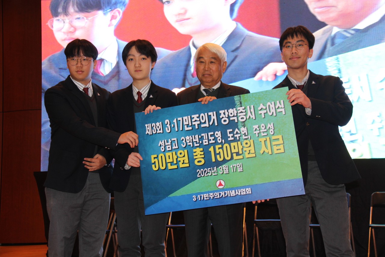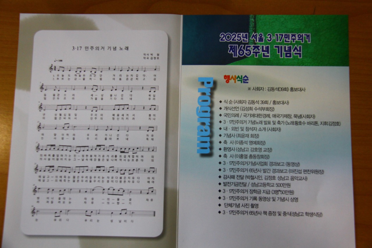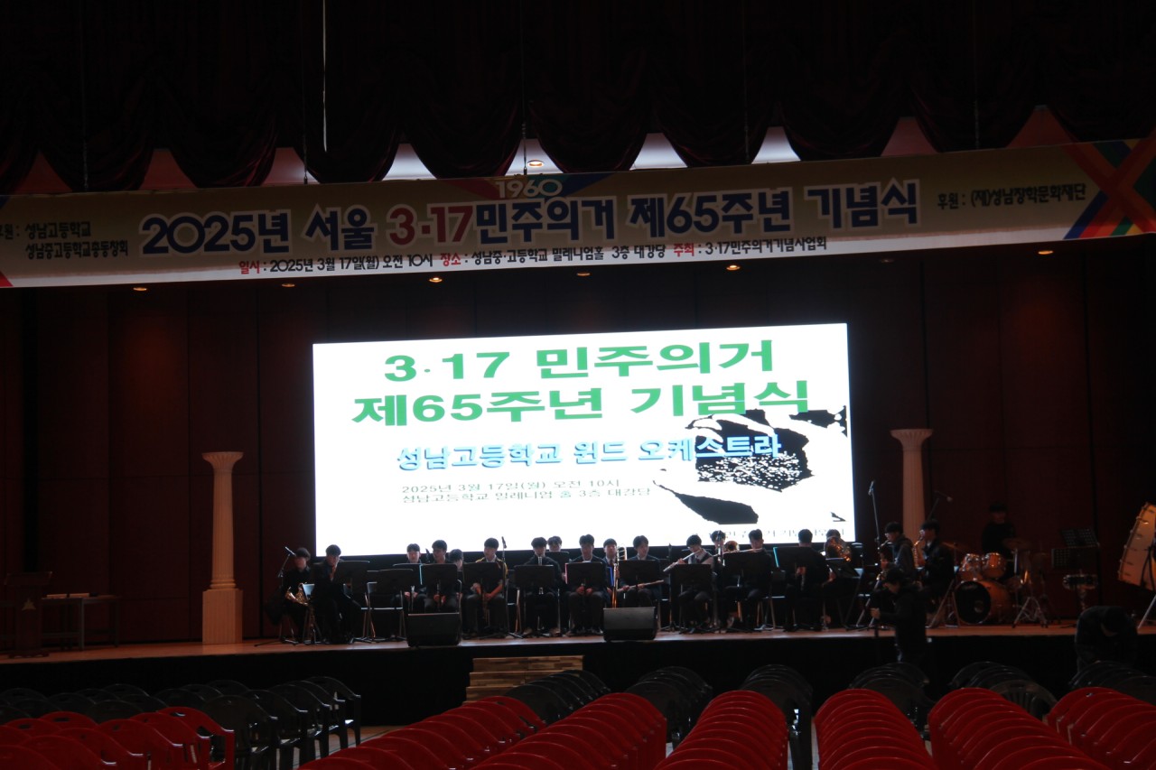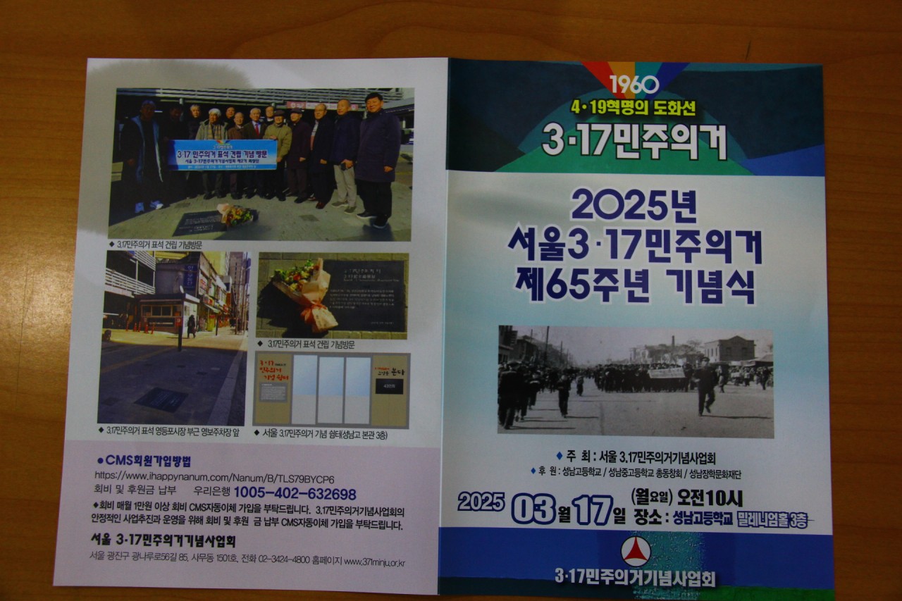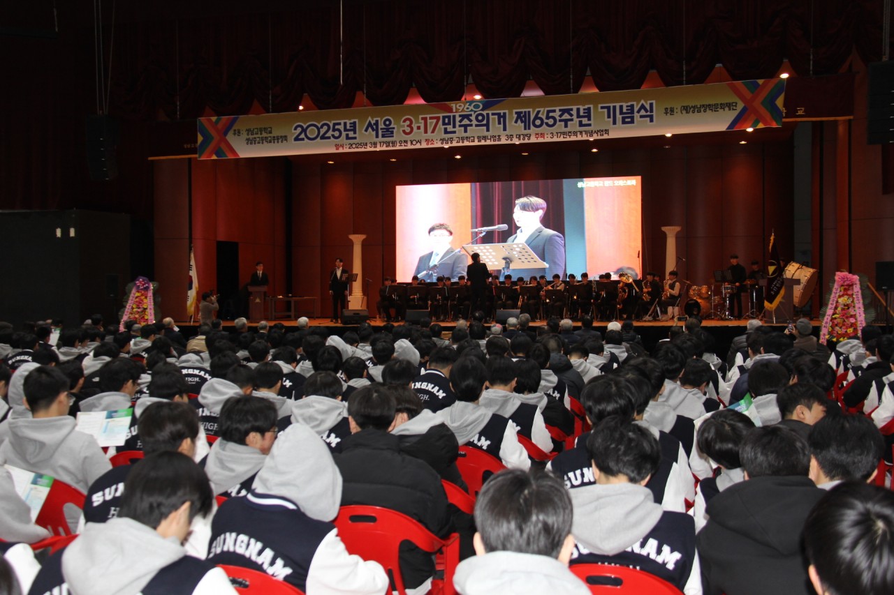 2025년 3월 17일 오전 10시 3.17민주의거기념사업회 주최로 3.17민주의거 봉기 제65주년 기념식을 성남고등학교 밀레니엄홀에서 거행하였다.  이번 기념식에는 3.17민주의거기념사업회 최윤재 회장과 임원 및 회원, 외빈으로는 성남중고등학교 강호영, 전범수 교장 선생님과 교직원 및 1학년 재학생, 성남중고등학교 총동창회 이홍열 회장과 임원, 3.17민주의거 주역 등 400 여명이 참석하였다. 김동석 (연기자, 본회 홍보대사, 성남고 39회 졸업생) 동문의 사회로 시작한 기념식은 국민의례에 이어 3.17민주의거 기념노래 발표, 참석자 소개, 최윤재 회장 인사말, 이종석 명예회장 축사, 강호영 성남고등학교 교장 환영사, 이홍열 총동창회장 축사가 있었다.  감사패 증정 순서에서는 3.17민주의거 기념시와 3.17민주의거 기념노래 작사가 박철 시인(성남고36회 졸업생)과 3.17민주의거 기념노래 작곡과 성남고 신교가에 3.17민주의거 정신을 표현해 3.17민주의거 정신 함양에 기여한 김정호 음악교사(성남고 60회 졸업생)가 감사패를 받았다. 본 회는 3.17민주의거 제65주년 기념식을 맞이하여 3.17민주의거 65년사를 발간하였고 성남고등학교에 500만의 발전기금을 후원하였다. 그리고  제3회 3.17민주의거 장학생을 선발하여 각 3명에게 50만원씩 150만원의 장학금을 지급하였다.  경과보고 순서에서는 3.17민주의거기념사업회 2024년 활동사항을 동영상으로 보고하고 3.17민주의거 기록 동영상과 기념시 낭독에 이어 참가자 단체사진 촬영하고 행사를 마무리하였다. 참석자 전원에게 3.17민주의거 65년사 책을 나누어 주고 학생식당에서 점심식사를 하였다. 식사 후 참석자 일부는 성남고 본관 3층에 개관한 3.17민주의거 기념 쉼터를 방문하였다.