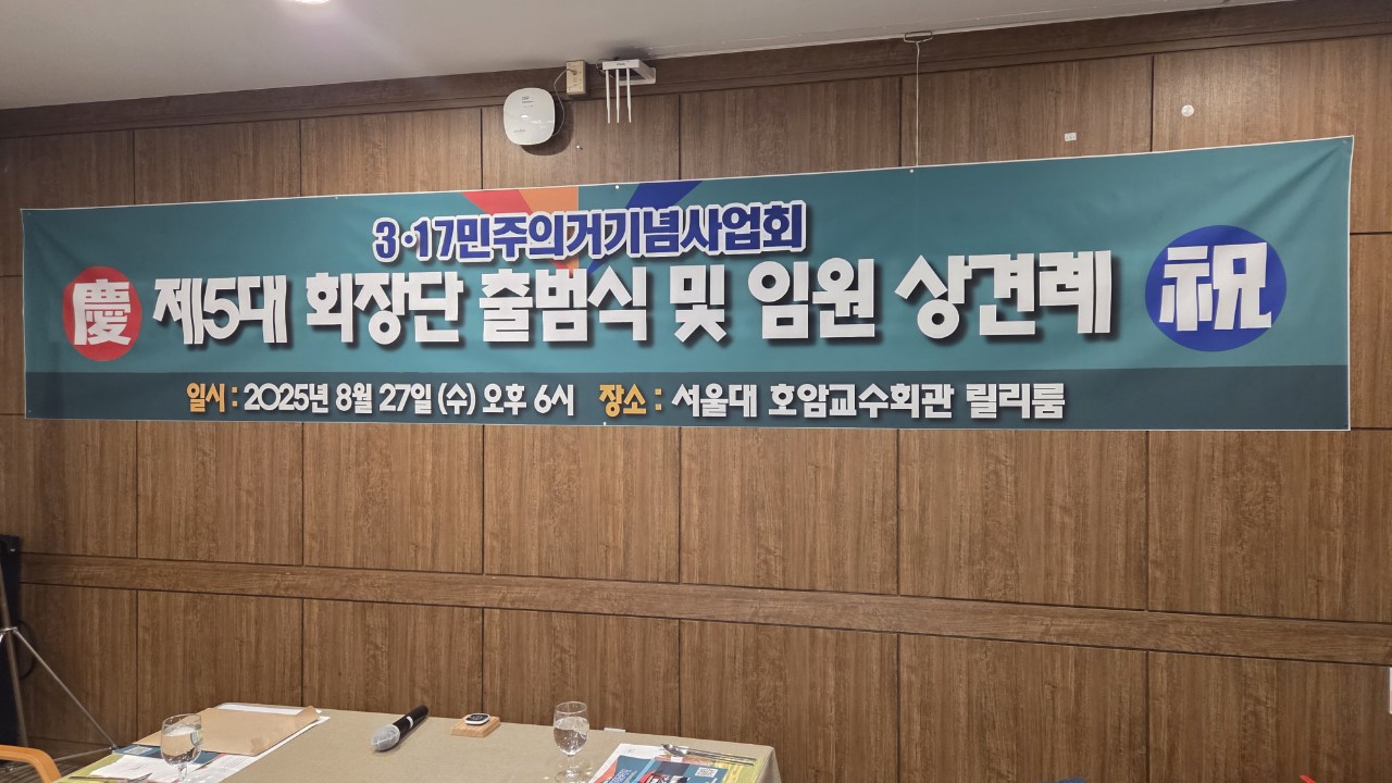 3.17민주의거기념사업회는 2025년 8월 27일  오후 6시 서울대 호암교수회관 릴리홀에서 제5대 회장단 출범식 및 임원 상견례를 개최하였다. 이번 행사에는 조범구 회장, 최윤재 명예회장과 이번에 선임 된 임원 여러분들과 이홍열 총동창회장, 김기원 총동창회 사무국장이 참석하여 출범을 축하하였다. 조범구 회장은 비젼 발표식에서 1. 3.17민주의거 국가기념일 지정  2. 3.17민주의거기념사업회 국가지원금 확보  3. 3.17민주의거 길 조성  4. 재정 안정화를 위해 CMS매월 500만원 증모를 선언하였다.