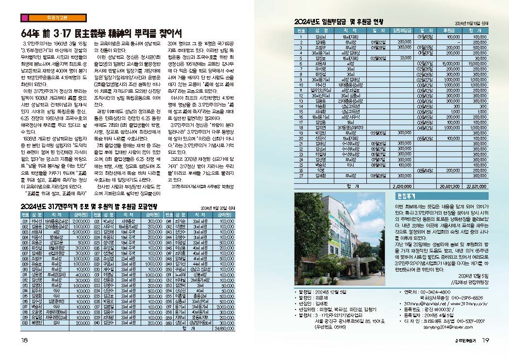 제32조(재정 공개) 본회는 인터넷 홈페이지(http://www.317minju.or.kr)와 국세청 홈페이지를 통하여 연간 기부금 모금액 및 활용실적을 매년 3월 31일까지 공개한다.