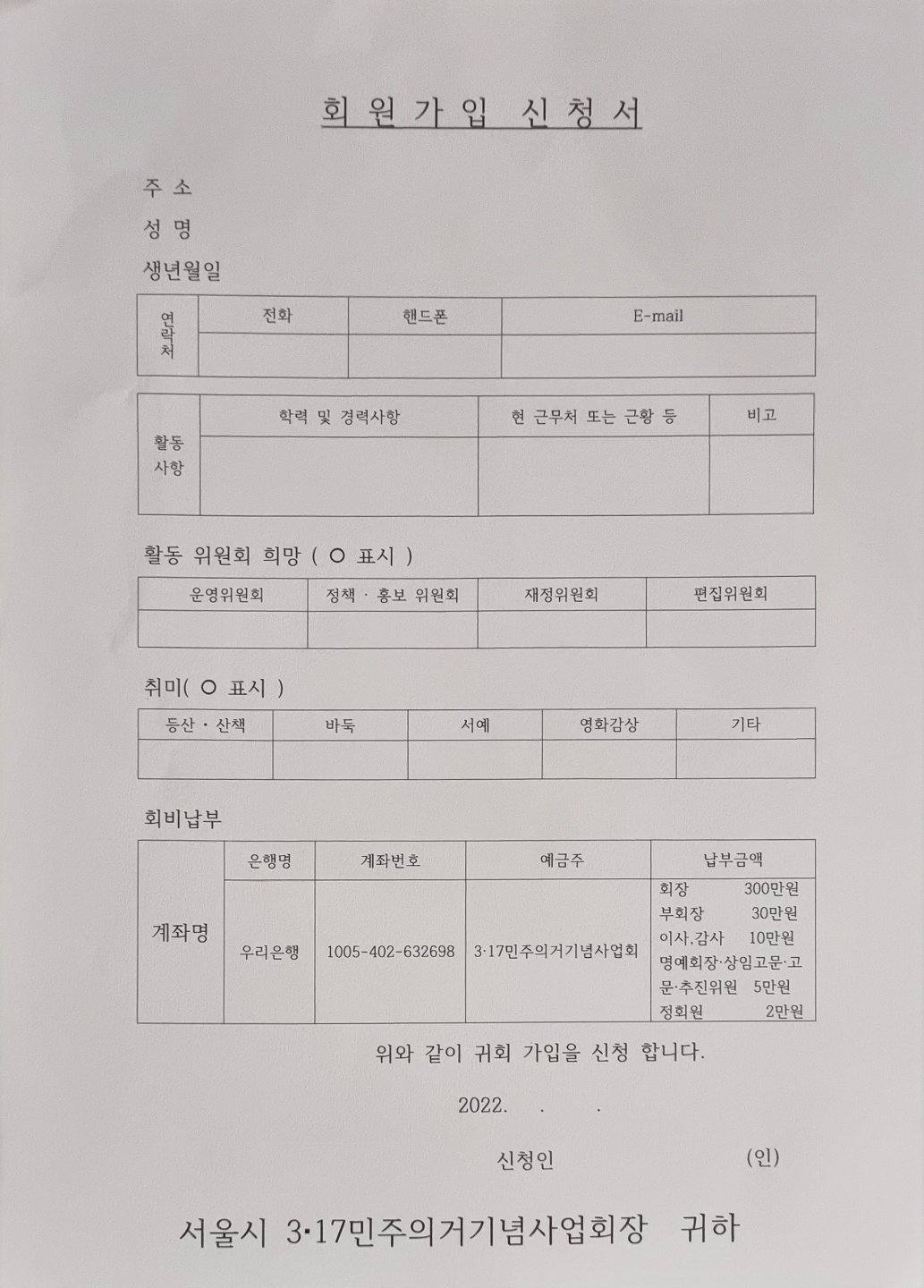 ㅡ 회비 : 우리은행 / 3.17민주의거기념사업회 / 1005-402-632698